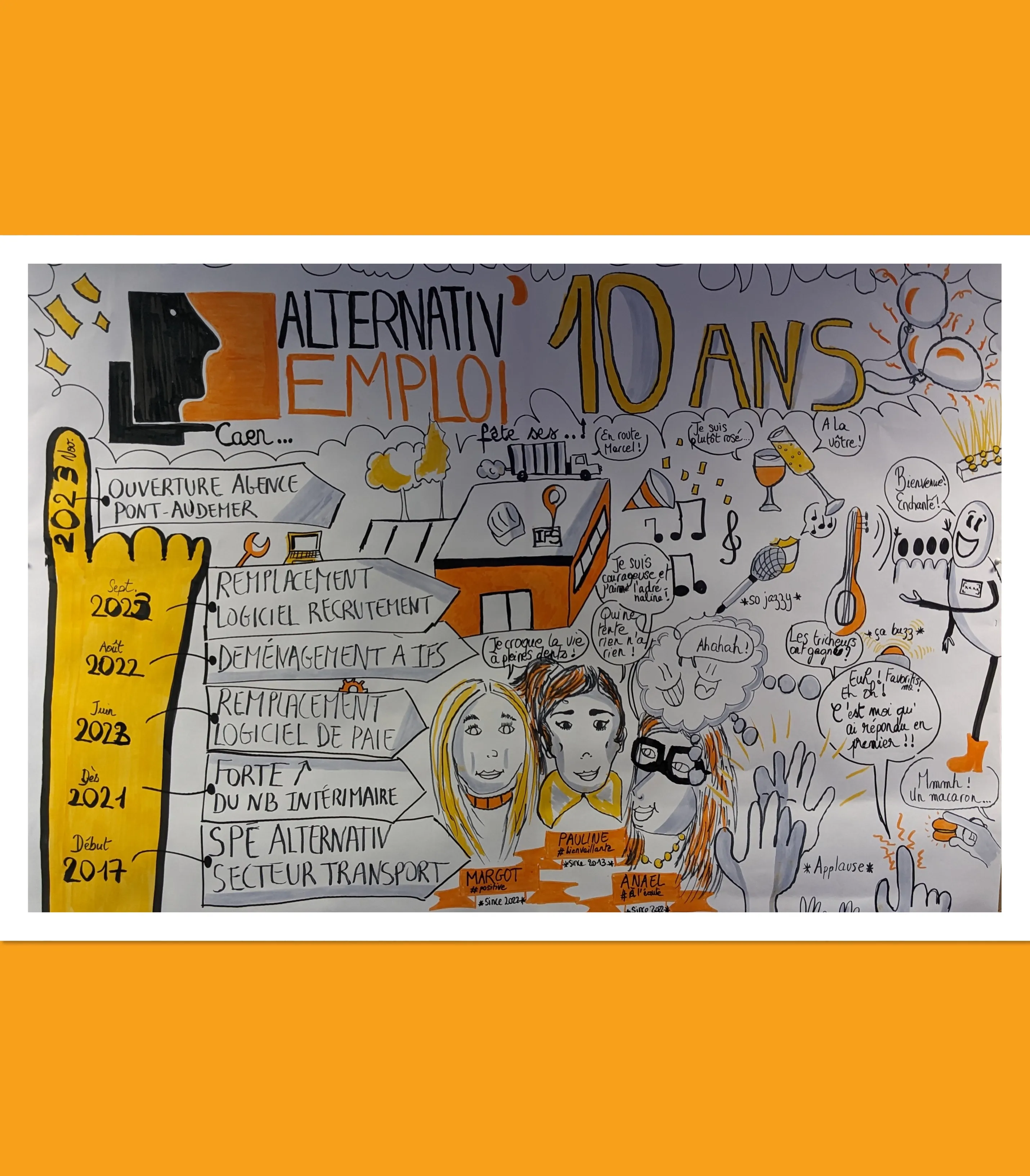 6 mois plus tard, le 16 novembre 2023, me voilà de retour chez Alternativ’Emploi. Cette fois, non plus pour un test, mais pour une mission : célébrer les 10 ans de l’agence avec une fresque murale dédiée. Le ton était résolument festif mais j’ai dû refuser la coupe de champagne (j’attendais un heureux événement). Pour cette occasion, j’ai réalisé une fresque murale fidèle à l’ambiance de la soirée. La fresque habille encore les murs de l’agence, comme un témoin de cette soirée et de cette aventure partagée.