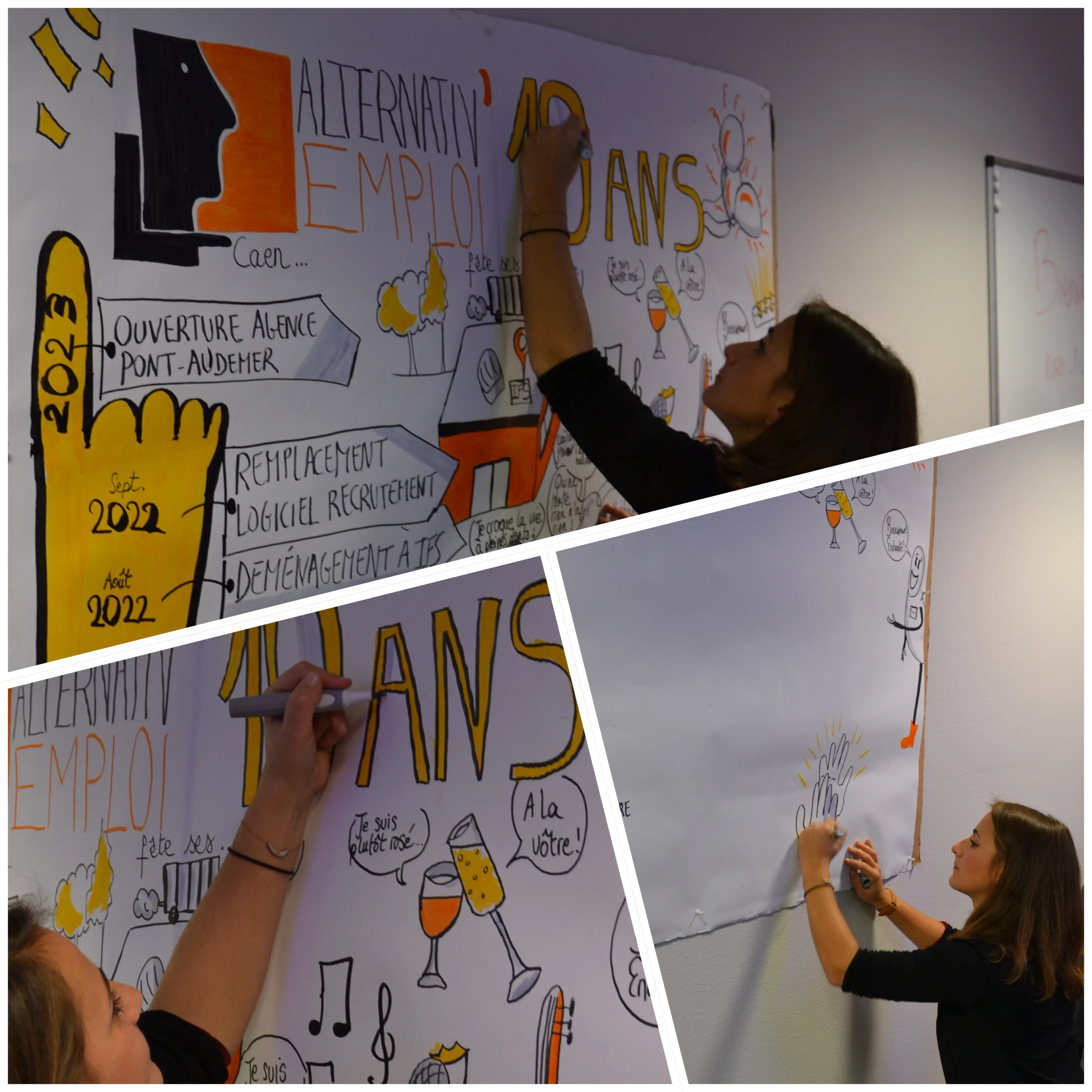 Pauline Mathiaud, ma belle-sœur dans la vie, était responsable de l’agence d’intérim de Caen. De mon côté, je me formais à la facilitation graphique, avec en tête l’envie – un peu folle – de lancer mon activité.